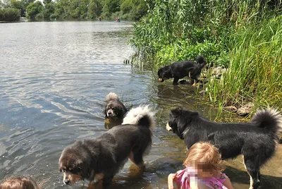 Niemand hatte bemerkt, dass inzwischen zwei Kanus an "unserer" Planschbucht angelegt hatten. Die Hunde freuten sich über die Abwechslung. Wer von ihnen hatte je eine schwimmende Futterdose gesehen, in der Menschen sassen. Nach kurzem Herzstillstand meinerseits zeigte sich, dass die Insassen zum Glück Hundefreunde waren, die es nicht störte, von so vielen DoKhyi umwuselt zu werden. Nach nochmaligem Abkühlen fuhren wir dann zu Heike.